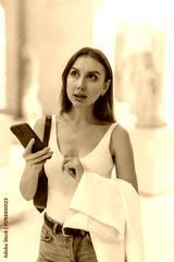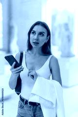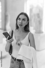 Young European woman studies information about the exhibits on her phone. Beautiful woman reading online guide to the museum in the hall of sculptures