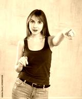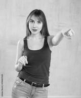 Cheerful young woman dressed in t-shirt gesturing in studio