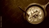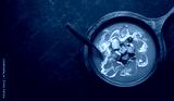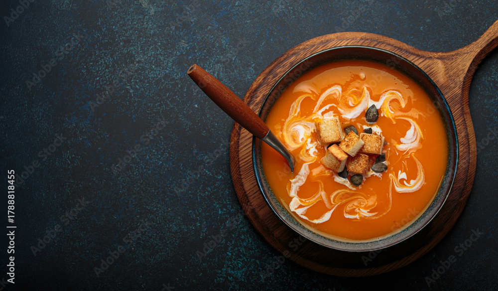Creamy pumpkin soup served in a bowl, garnished with crunchy croutons and a swirl of dairy cream, ideal for autumn top view space for text