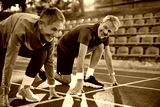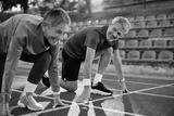 Mature couple of runners on start line getting ready to race each other.