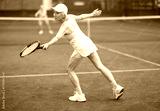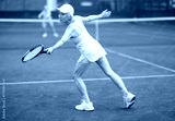 Rear view of enthusiastic sporty senior woman, leading active healthy lifestyle, playing tennis with female opponent behind net in background on outdoor court on summer day..