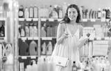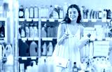 Young woman buyer chooses detergent in plastic bottle in household chemicals store