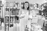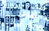 Young woman buyer chooses feminine sanitary pads in household chemicals store