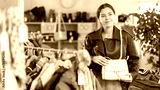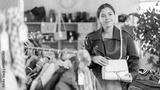 Young woman holds a handbag with a price tag on sale in a clothing and accessories store. Customer stands in a second hand store near the shelves with things