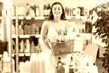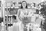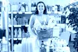 Young woman buyer with shopping basket chooses cleaning products in household chemicals store
