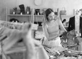 Glad young female customer reviewing jean shorts during shopping in clothing store