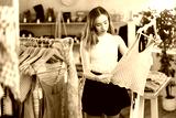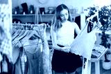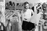 Thoughtful young female customer reviewing summer dresses during shopping in clothing store