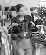 Cheerful european young woman buyer choosing new bra, imagines successful combination of underwear and new outfit in modern clothing store