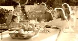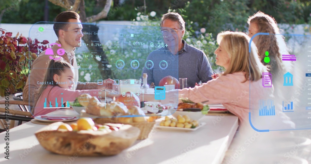 Chatting family passing dishes across backyard dining table, wooden fruit bowl and AR overlays