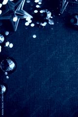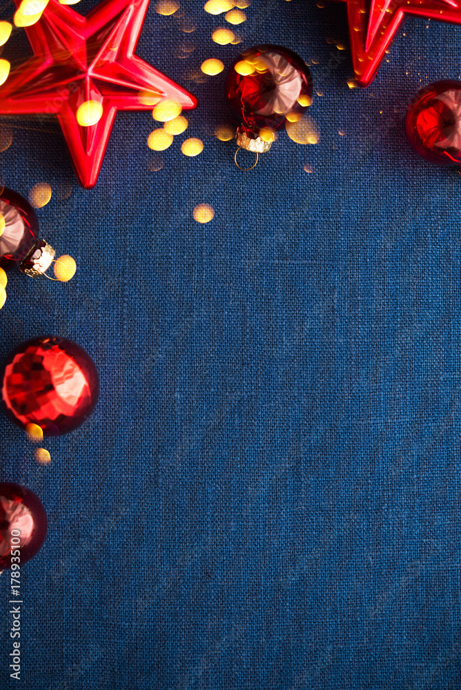 Christmas background with red ornaments and sparkle bokeh lights on blue canvas background. Merry christmas greeting card, banner. Winter holiday xmas theme. Happy New Year.