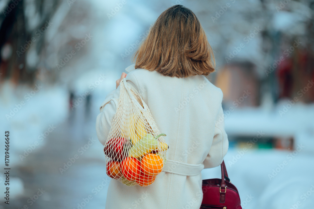 Urban Woman Shopping for Groceries in Winter Time. Shopper buying fruits and vegetables for Christmas