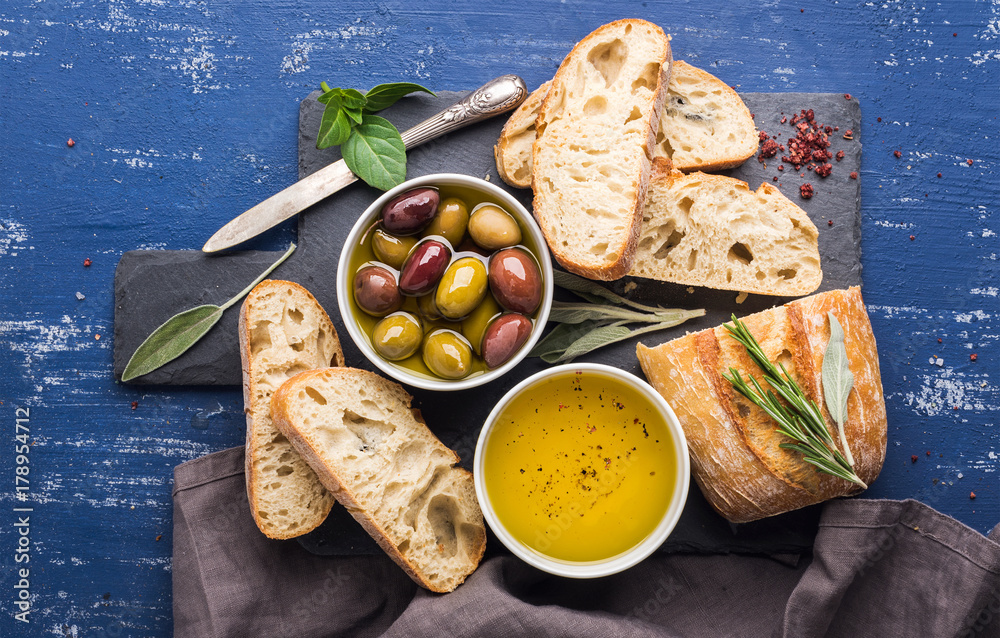 Mediterranean snacks set. Olives, oil, herbs and sliced ciabatta bread on black slate stone board over painted dark blue background, top view.