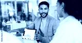 Meeting, business man and tablet screen with graphs for financial stats, kpi or stock market. Team, happy people and tech with chart for data analysis, risk management or trading discussion in office