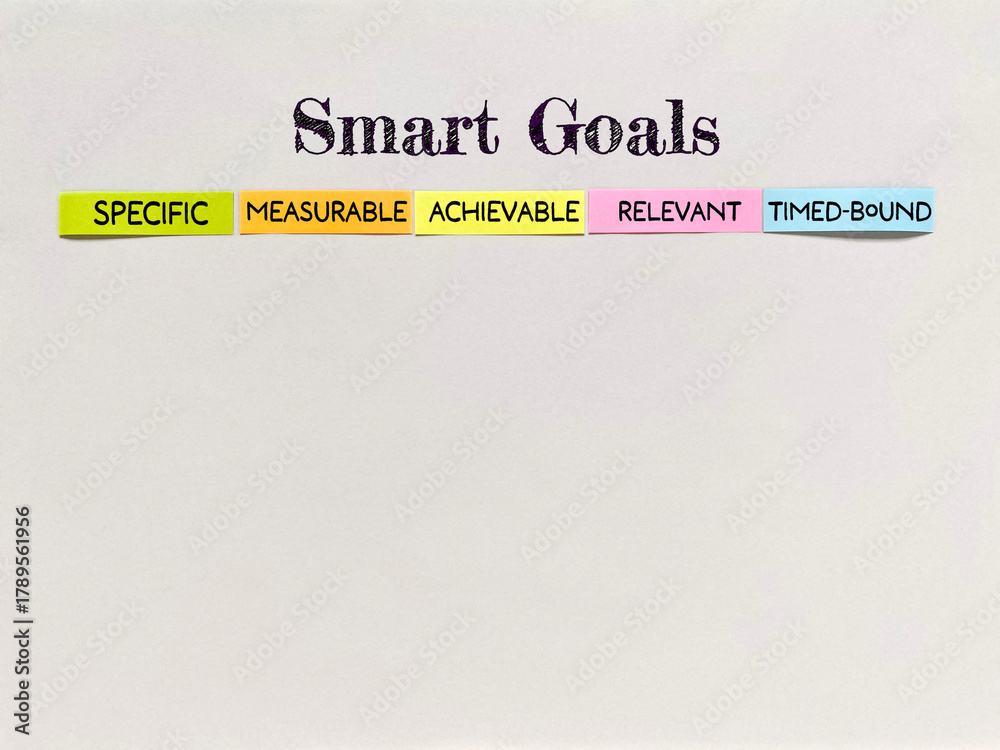 SMART goals concept with colorful notes showing specific, measurable, achievable, relevant, and time-bound goal setting.