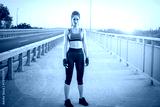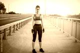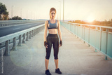 Full length portrait of sporty girl standing on bridge's sidewalk at sunset.