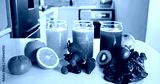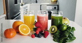 Nutrition, fruit and juice in kitchen for detox, antioxidants and vegan drink. Wellness, gut health and vegetables with organic liquid and ingredients in home for diet, breakfast and weight loss
