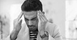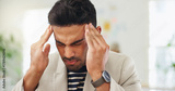 Employee, stress and man with headache, office and financial analyst with burnout, thinking and pain. Business, migraine and person with anxiety for project, reflection and overwhelmed with work