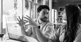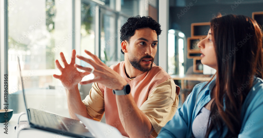Media agency, laptop and people with conversation, coaching and brainstorming for publication. Mentor, magazine editor or journalists with advice cooperation and pc with feedback, creativity or ideas