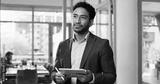 Businessman, tablet and thinking at office with review, decision and writing with insight at investment agency. Person, advisor or broker with fintech, app and asset management at finance company