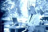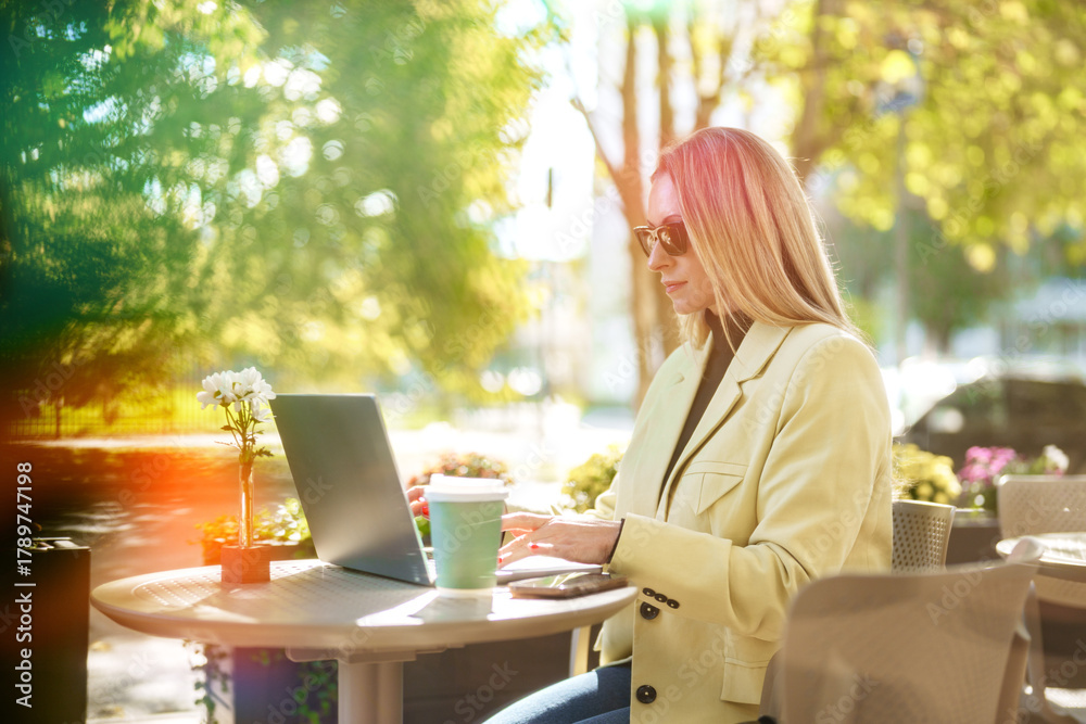 Working outdoors at a cafe table in spring sun with a laptop and drink