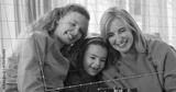 Leaning three females in coral, green knit, red headband, viewing phone on home sofa, purple grid