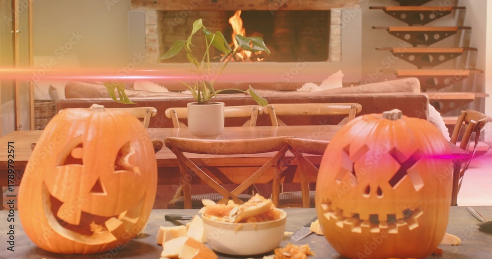 Glowing two carved pumpkins resting on tabletop at home, with bowl of guts and seeds, tools