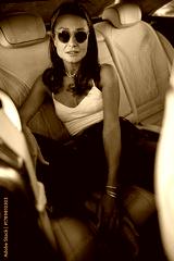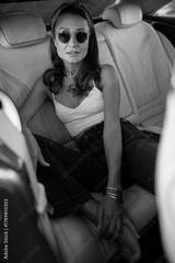 young woman sitting in car, sunglasses on, white tank top and denim jeans, reclining on cream leather seat, sunlit interior