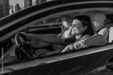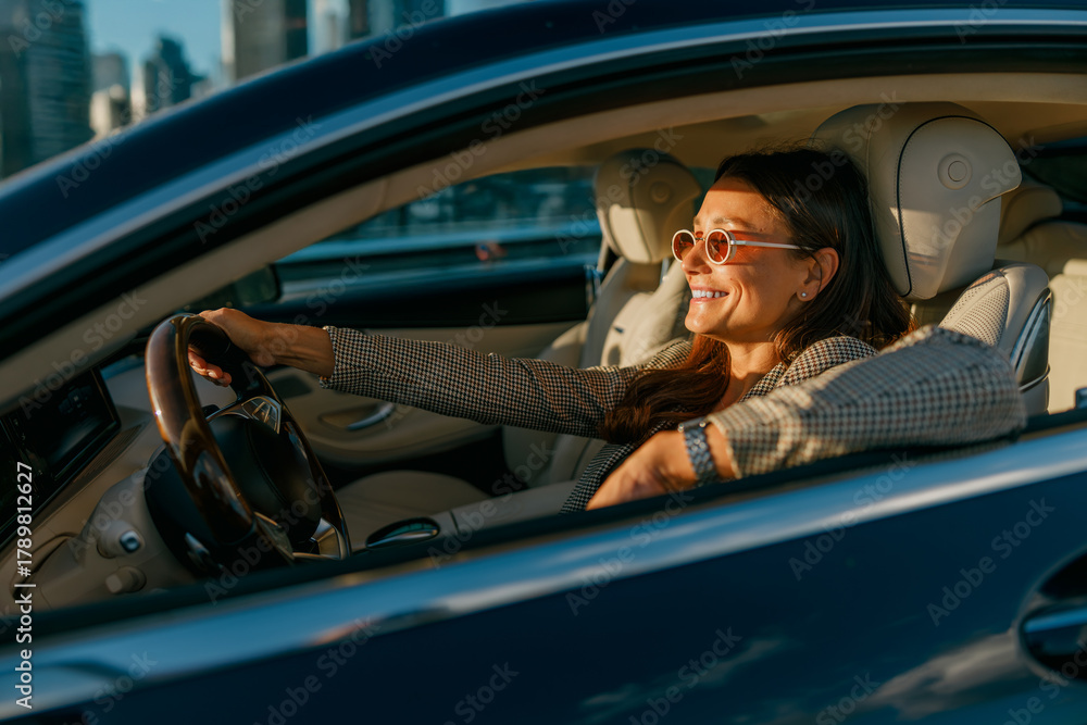 Woman relaxed at wheel watching sunset, contemplative gaze toward city skyline, warm dusk light bathes interior and creates