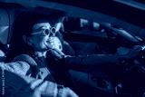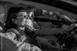 Woman poised at wheel in city, confident expression and sunglasses reflect determined morning commute, sleek interior and skyline
