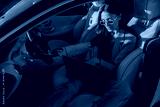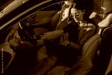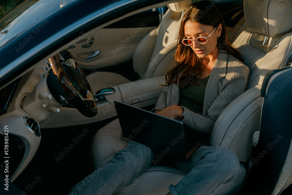 Woman setting mobile workspace in car, laptop balanced on knees while sipping coffee, focused on planning and project tasks, calm