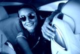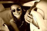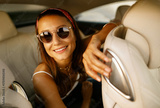 Smiling woman leaning forward in backseat wearing sunglasses and bandana, candid summer travel vibe in leather interior with warm