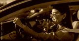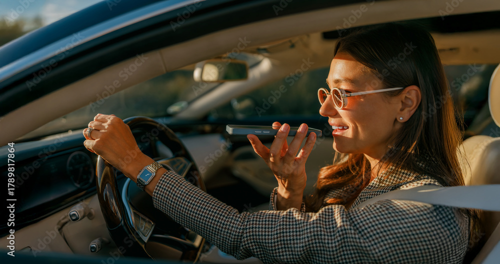 animated woman gesturing while driving speaking with expressive hands, sunglasses perched, warm golden light, casual outfit,