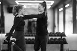 Two women engage in a friendly stretching exercise at a gym during a workout session in the morning