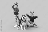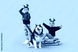 Happy little children in reindeer horns with cute Husky dog and sledge on blue background