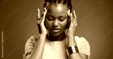Stress, pain and black woman in studio, headache and overwhelmed on blue background. Space, migraine and African person with burnout, health risk and pressure with anxiety, tired and brain fog