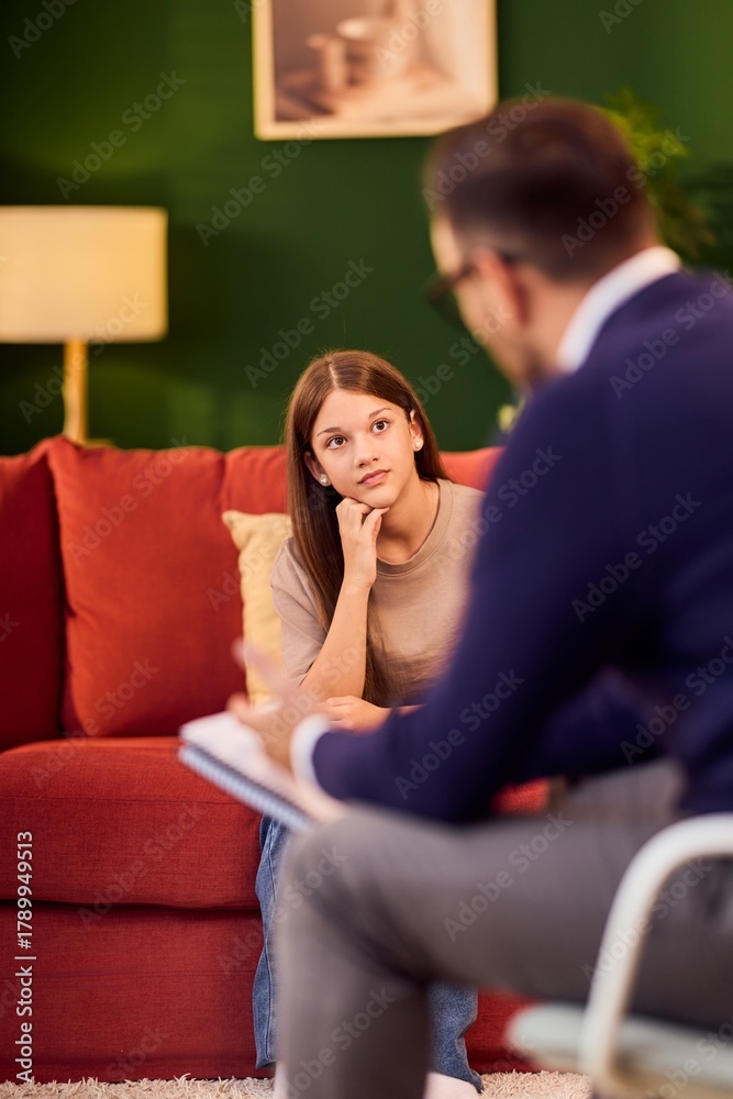 Young Woman and Therapist Discuss Counseling Session In Cozy Psychology Office