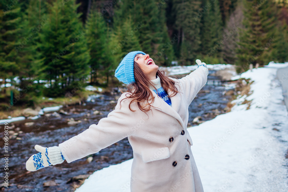 Happy young woman traveler relaxing enjoying snowy mountains and river view wearing white warm fur coat. Winter