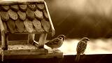 Two Eurasian Tree Sparrows (Passer montanus) feeding at a wooden bird feeder