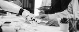 A futuristic scene in a business meeting where a robotic arm interacts with human hands, highlighting advancements in technology and corporate collaboration.Noogenesis
