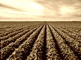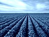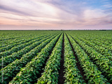 Green soybean plants growing in rows on farm field