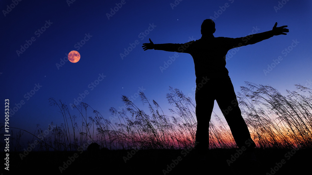Silhouette of a man and countryside under the Moon, stars and planets in blue hour time.