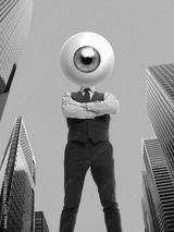 Man with giant eyeball head standing among skyscrapers in urban surveillance composition. Concept of corporate control, observation, privacy loss, and visual dominance in modern power systems.