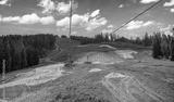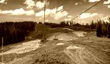 An old, rusty double chairlift ascends a grassy, sunlit ski slope surrounded by vibrant green deciduous trees under a bright blue sky with scattered white clouds.