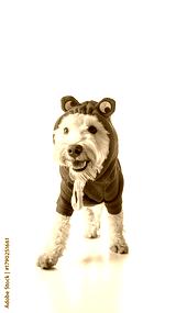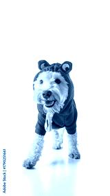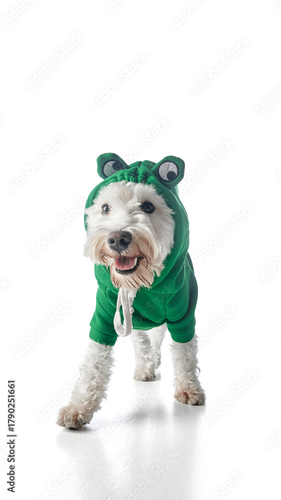 White terrier wearing green frog hoodie isolated on white background. Concept of humor, cuteness, personality for pet apparel design, social media, and creative advertising visuals.