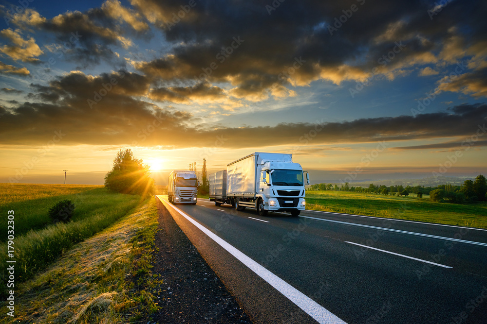 Small truck overtakes heavy truck on the asphalt road in rural landscape at sunset with dark clouds