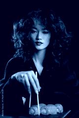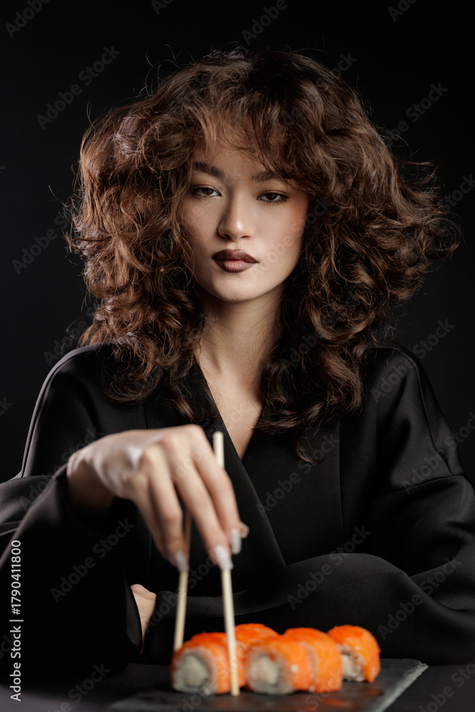 Asian female with curly hair enjoying sushi in elegant black outfit, Fashion photo Philadelphia roll food