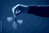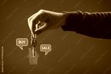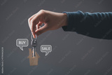 Close-up of a hand holding a house keychain with buy and sale icons, representing real estate, property investment, housing market, and home ownership business concepts.