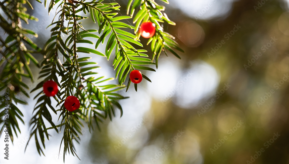 Taxus baccata branch with red berries and green needles illuminated by sunlight, natural forest background, soft focus botanical detail.