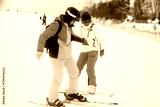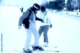 Skiing lessons with a professional instructor on a snowy slope during winter in a scenic mountain resort