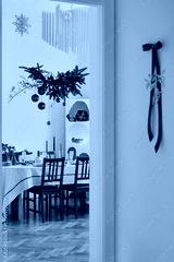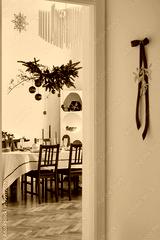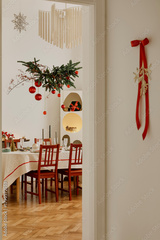 Festive dining room decorated for Christmas with red chairs, elegant table setting, and hanging evergreen branch with red ornaments.